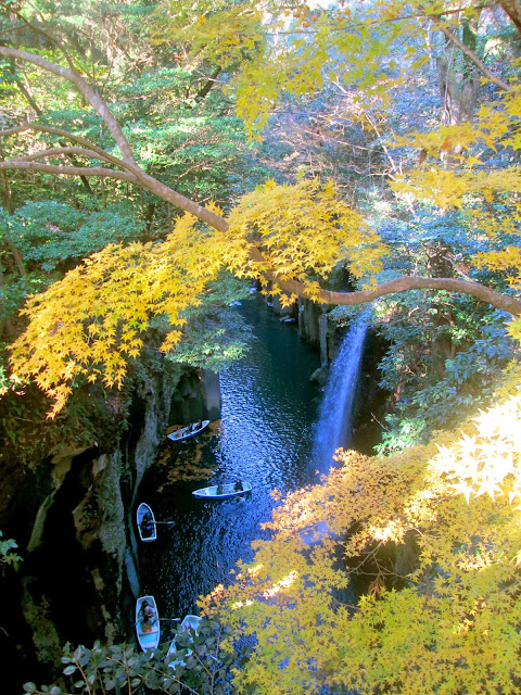 The next weekend jaunt in store was a little closer to home: Takachiho, in the north of the prefecture. Annica, a chum from Miyazaki, and I picked up Alissa and Jo in Nobeoka and continued road trippin up through breathtaking valleys of autumn leaves. Our destination was Takachiho-kyo or gorge, one of the most famous sights on Kyushu.